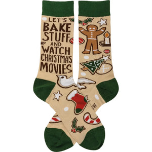 These colorful socks feature woven designs with coordinating "Let's Bake Stuff And Watch Christmas Movies" sentiment. Cotton, nylon, spandex. One size fits most.