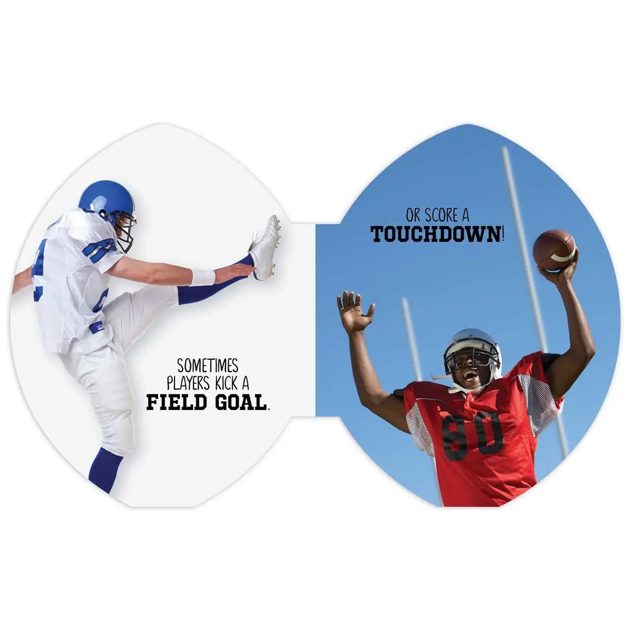 Touchdown! Learn all about football with this shaped board book that looks and feels like a football! Perfect for anyone who wants to get their child started early, Let’s Play Football teaches little ones the basic terms of the game. Shaped like a football, the book also features a textured, padded cover that feels like the real thing! Photographic interiors feature simple text that focuses on the joy of the game for kids and parents alike. Because having fun is the most important part!