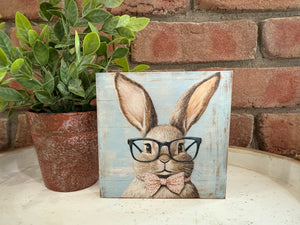 Enjoy whimsy and humor with the darling Bunny In Black Glasses Block. The wood block shows a smart-looking soft gray bunny in a dapper bowtie and bold black glasses. The freestanding block has distressed edges for a rustic farmhouse look and measures 5" square by .5" deep. Sure to deliver springtime cheer. Made in the USA.