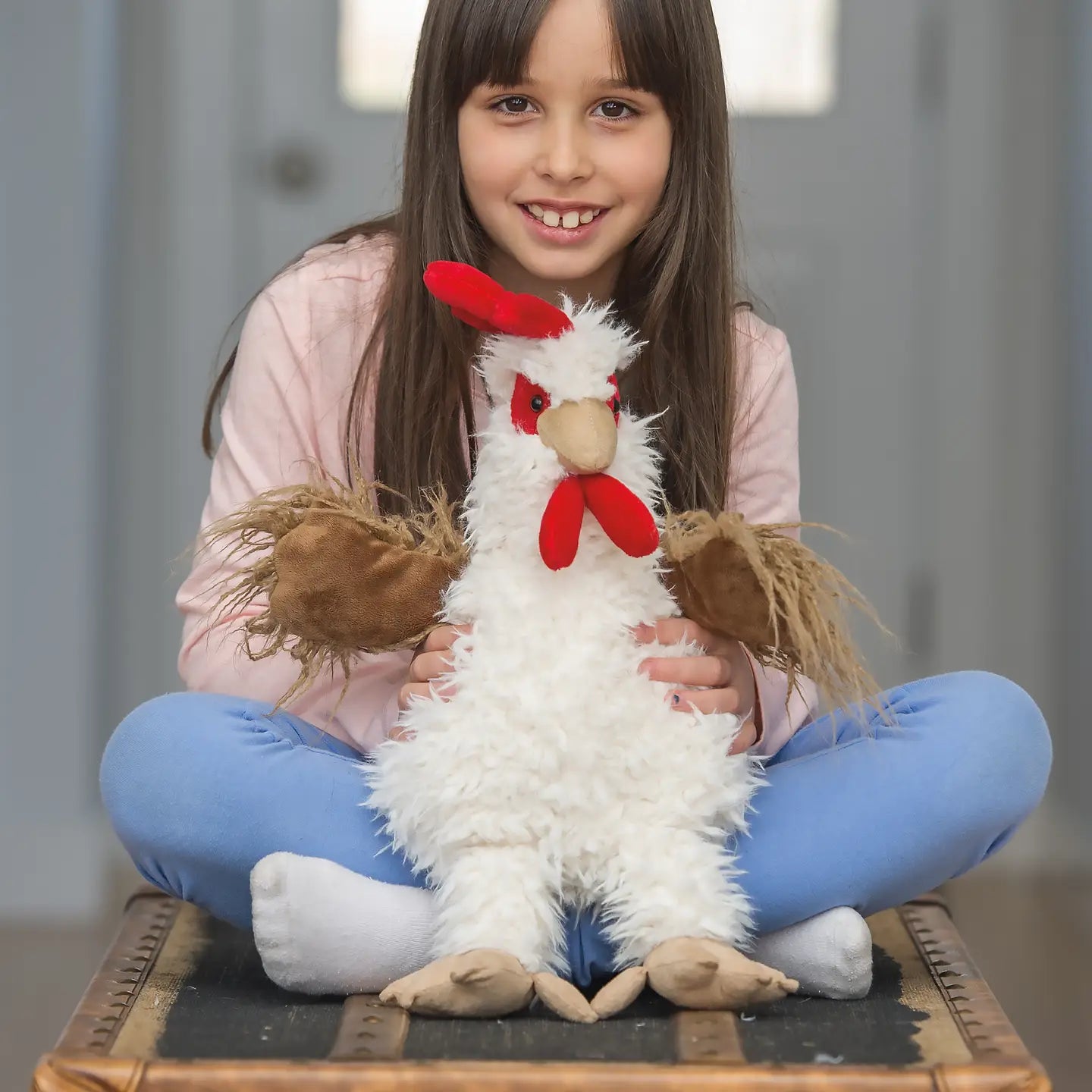 The Fab Fuzz rooster from Mary Meyer lets the fabric be the show. Sweet, huggable friends with special fabrics and details that let their charm and personality shine through. FabFuzz Rooster has soft, padded wattle and comb in bright red fabric, a soft beak, plastic eyes and nice detailing on . Measures approximately 16-inches. Care for by washing in cold water on gentle cycle, air dry.