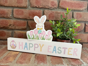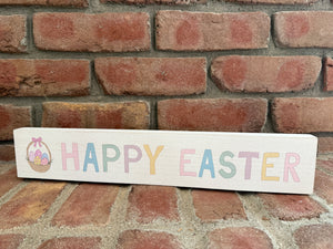 White Washed Wood Sitter with Easter Eggs in Basket and Colorful Text on Front