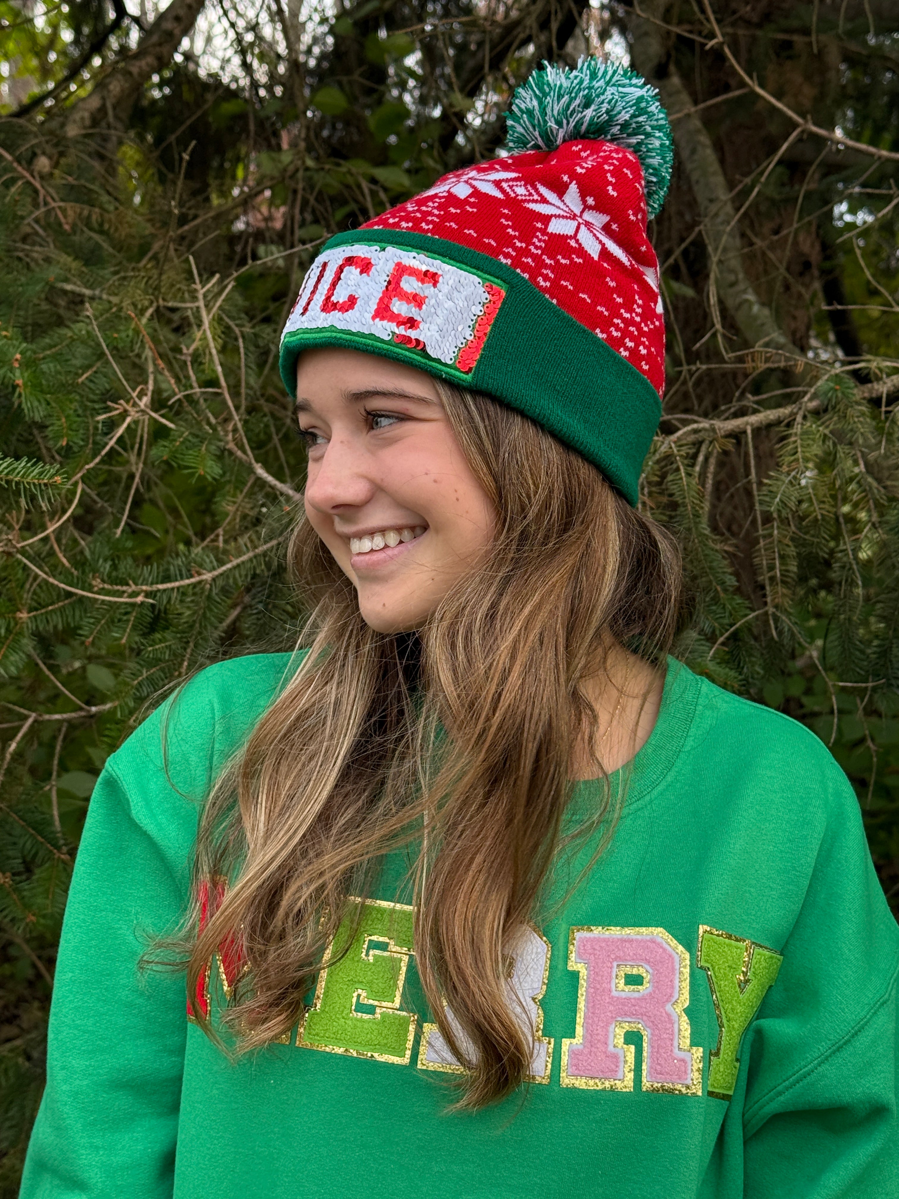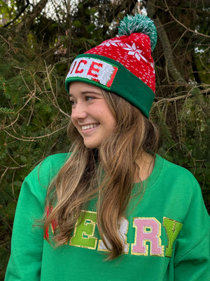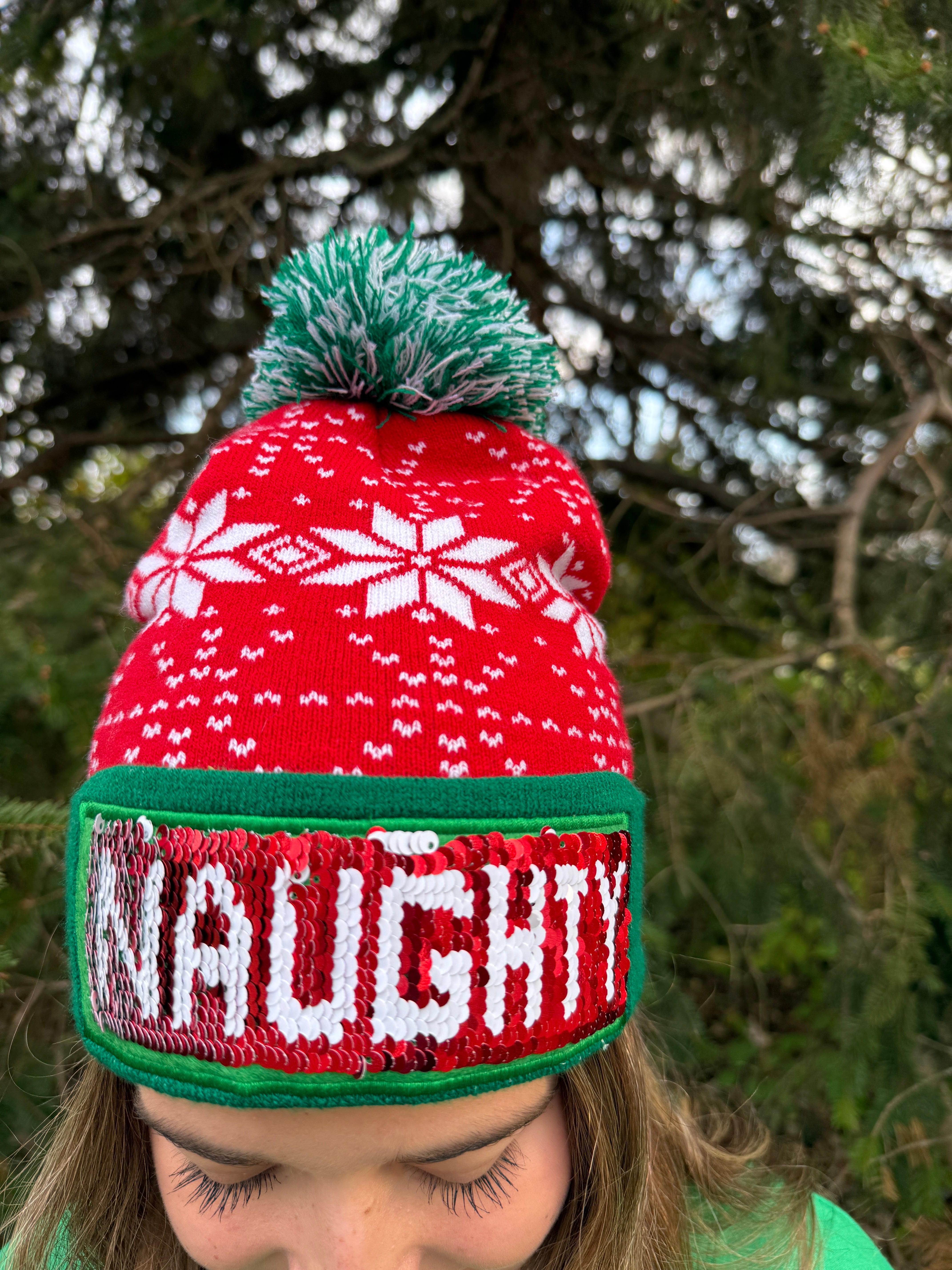 Have a merry good time with this fun changeable pom hat! Perfectly layered sequins can be swiped either way to show "naughty" or "nice". Great for holiday outings, parties and gifts!