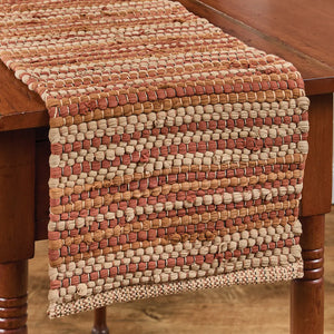 Enhance your fall dining experience with the Hayfield Chindi Table Runner. Crafted from soft cotton chindi fabric, this runner features a charming striped design in warm shades of copper and tan, perfectly capturing the essence of autumn. Measuring 13" x 54”, it adds a touch of rustic elegance to your table setting, making it ideal for seasonal gatherings or everyday use. The unique texture and earthy tones create a cozy atmosphere, bringing the beauty of the harvest season indoors.