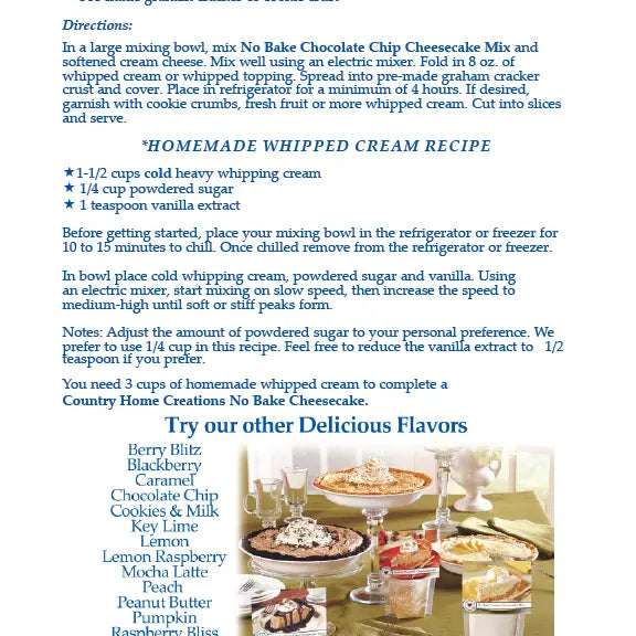 Indulge in a rich, decadent treat with our No Bake Chocolate Chip Cheesecake Mix! Loaded with real chocolate chips, this creamy, dreamy dessert is a breeze to prepare. Elevate your dessert game with this no-fuss cheesecake that's bursting with chocolate flavor. Whether you're craving an after-dinner delight or a sweet weekend indulgence, this mix makes it easy to whip up a restaurant-worthy cheesecake in your own kitchen.